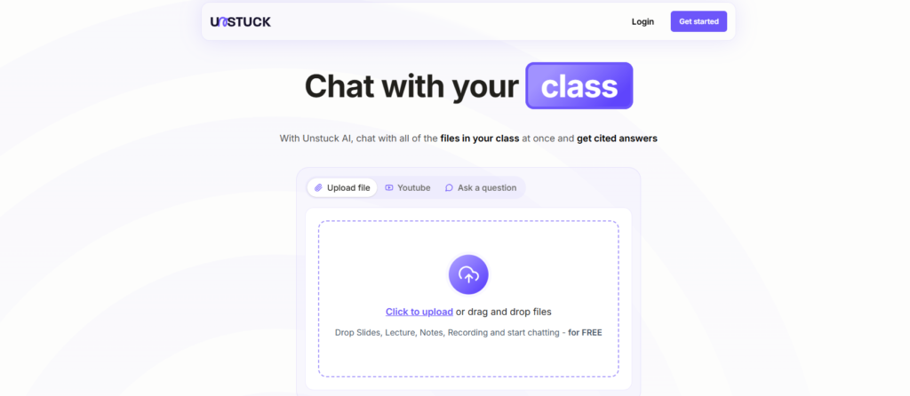 Once logged in, you can upload your study materials, such as textbooks, notes, or assignments. Unstuck study AI supports multiple file formats, making it easy to incorporate all types of learning content.